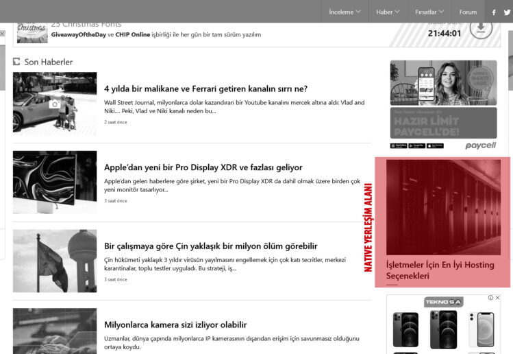 https://www.chip.com.tr/ (Chip Dergisi) native yerleşim alanı sitenin sidebar bölgesindedir. Yukarıdaki görselde kırmızı renkle işaretlenmiş olan bu alan, hem ana sayfada hem de haber detay sayfalarında aynı bölgede yer almaktadır.
