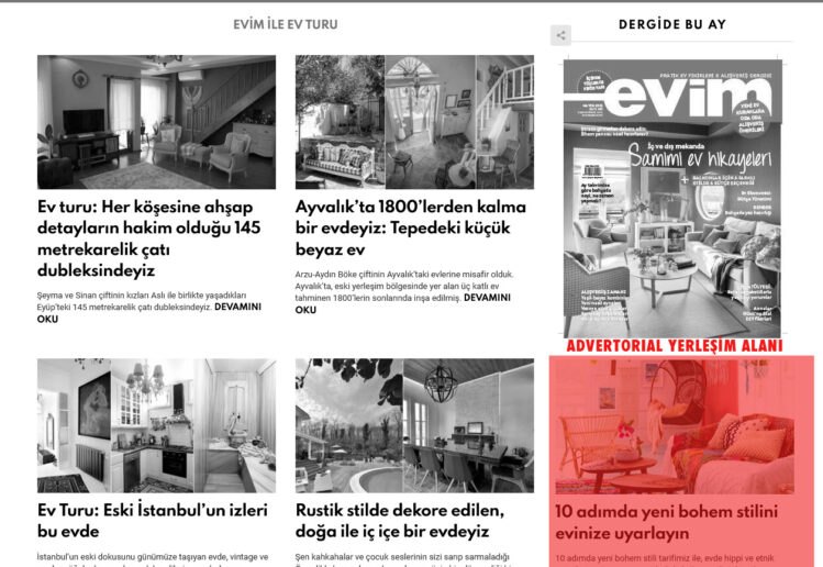 Evim Dergisi – Advertorial Ölçüleri ve Yerleşim Alanı